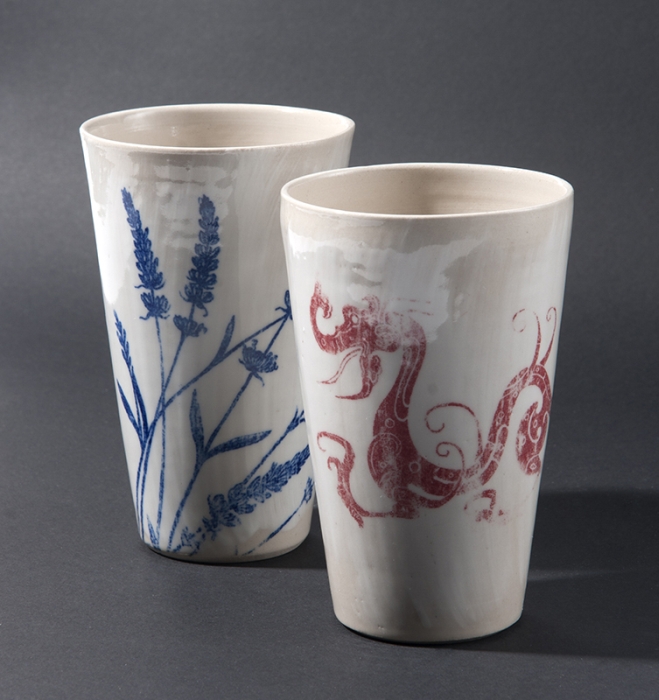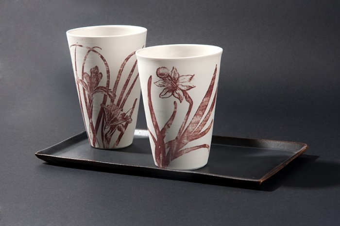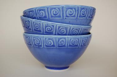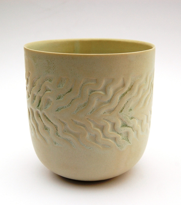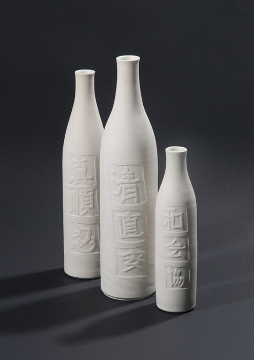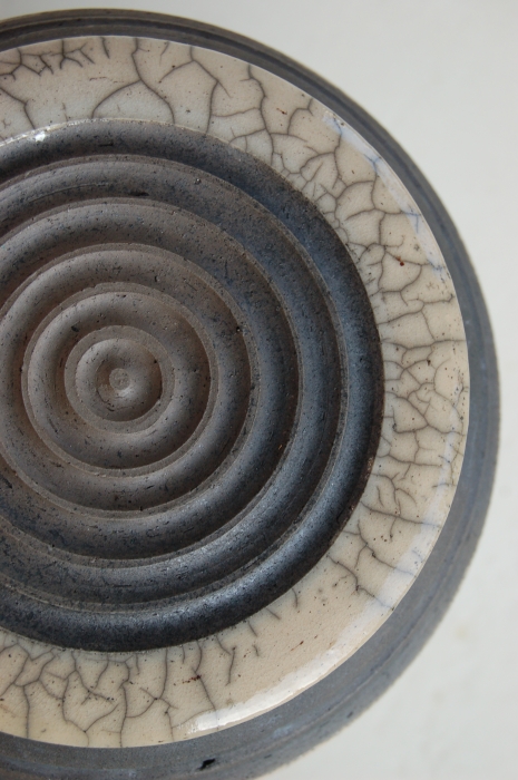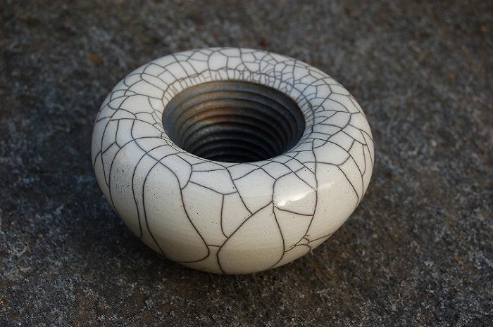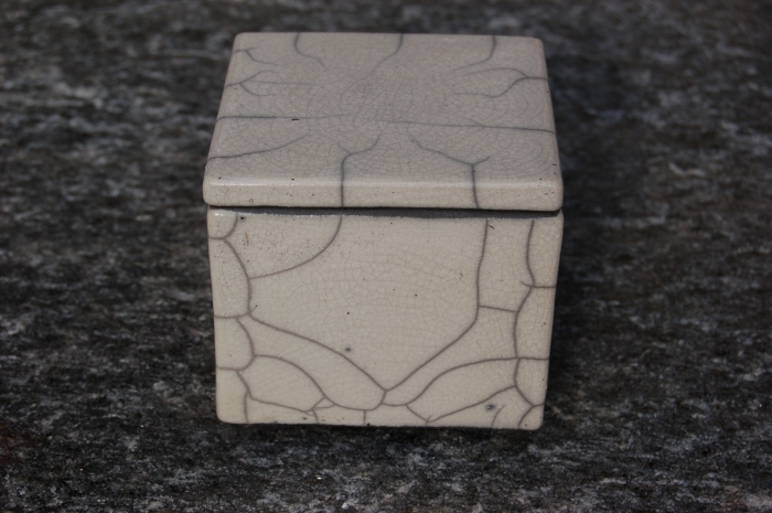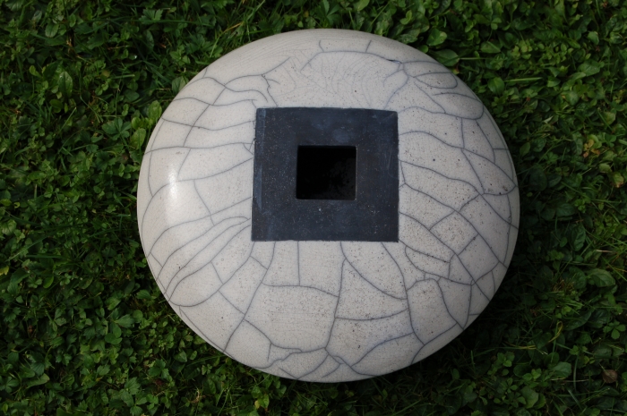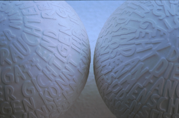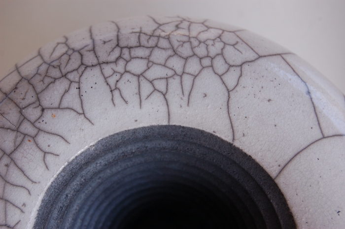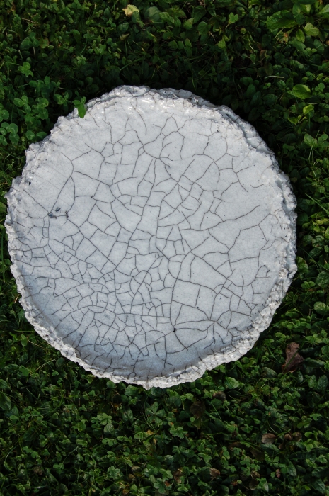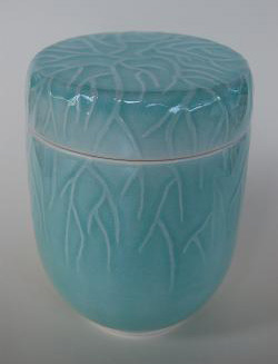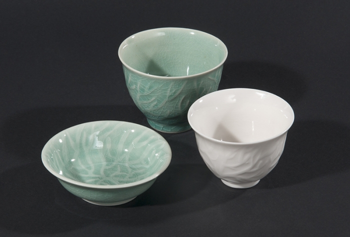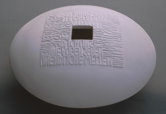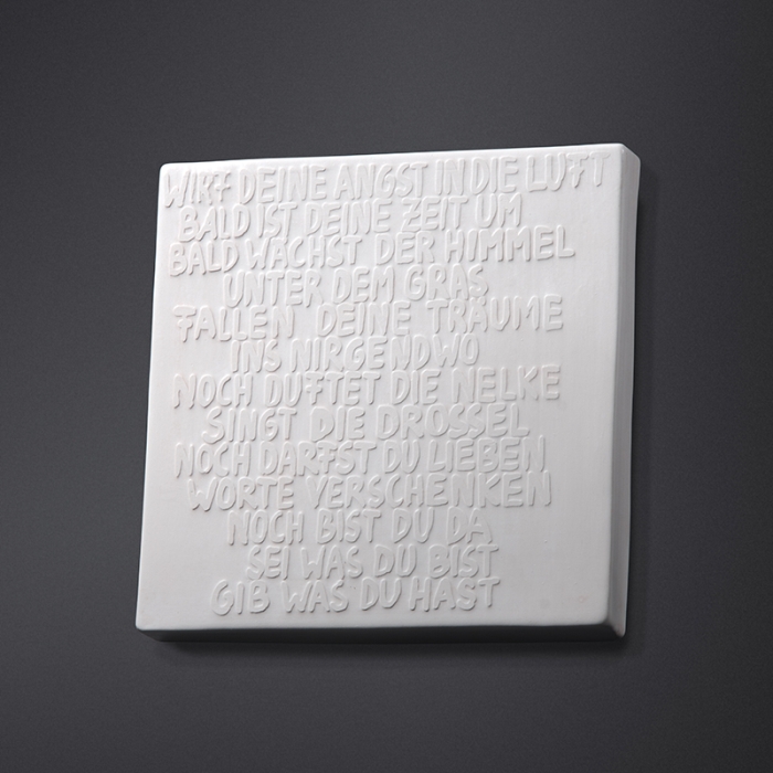 Die Feinheit und Weiße des Porzellan nutze ich häufig für Reliefmuster, farbig-transparent glasiert lassen sie subtile Farbabstufungen entstehen. Weiß auf weiß werden Texte, meist Lyrik, lesbar. Erweitert wird das Spektrum meiner Tätigkeit durch themenbezogene Arbeiten und das Experimentieren mit Raku und Glas.