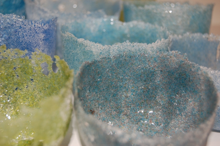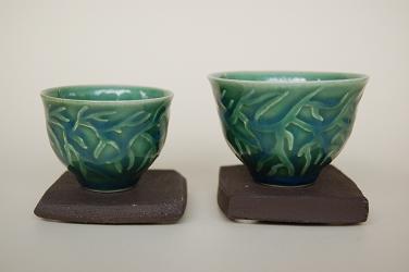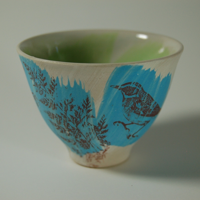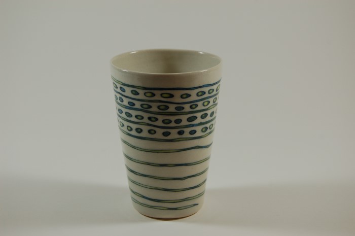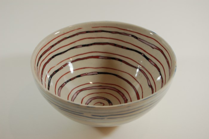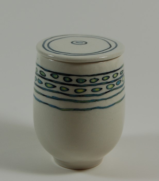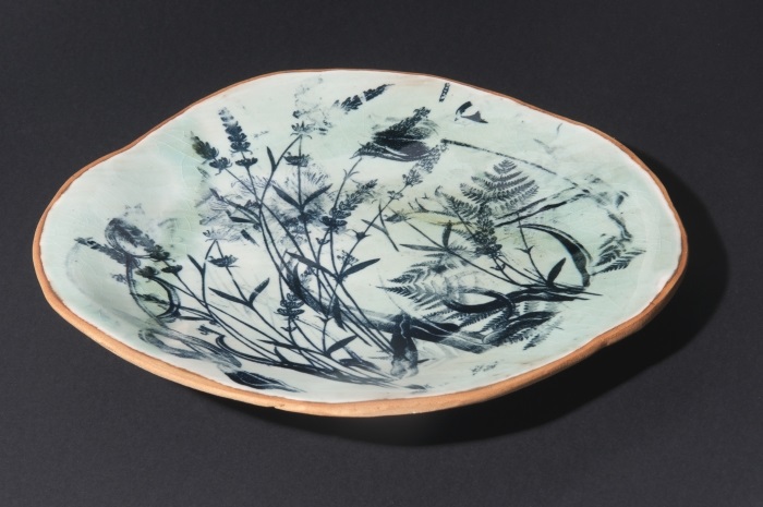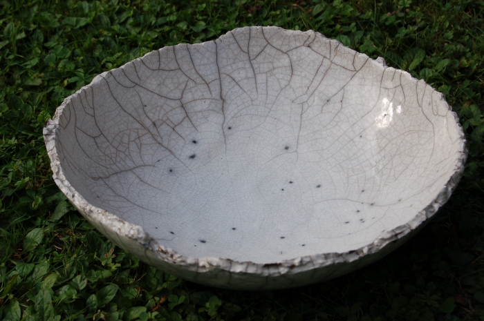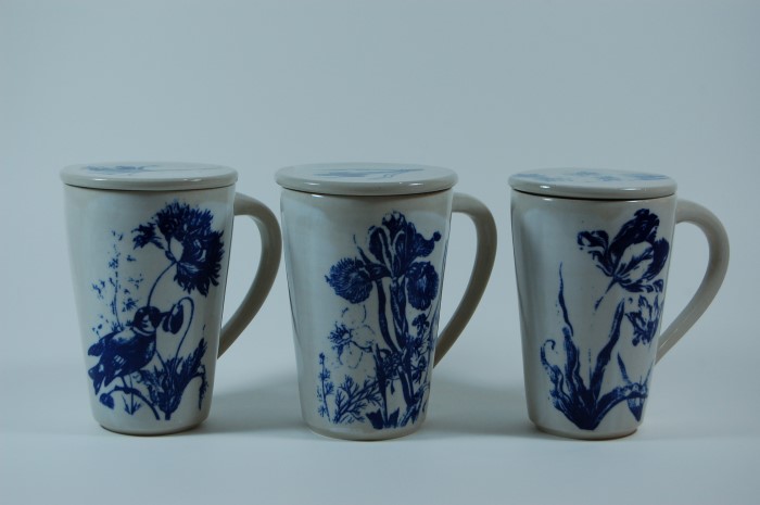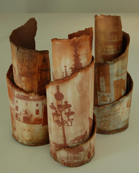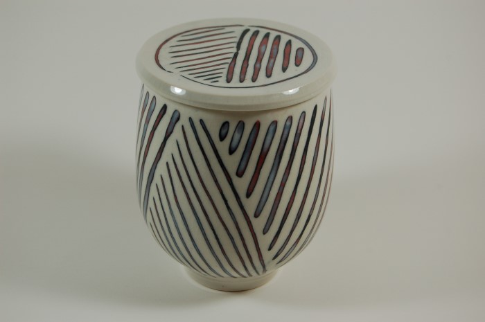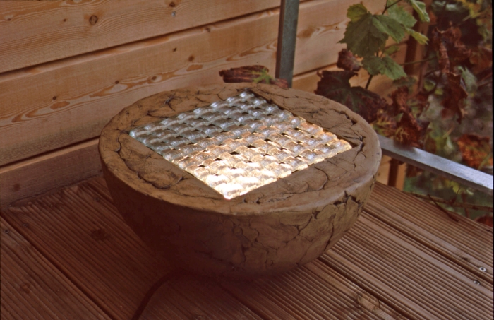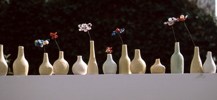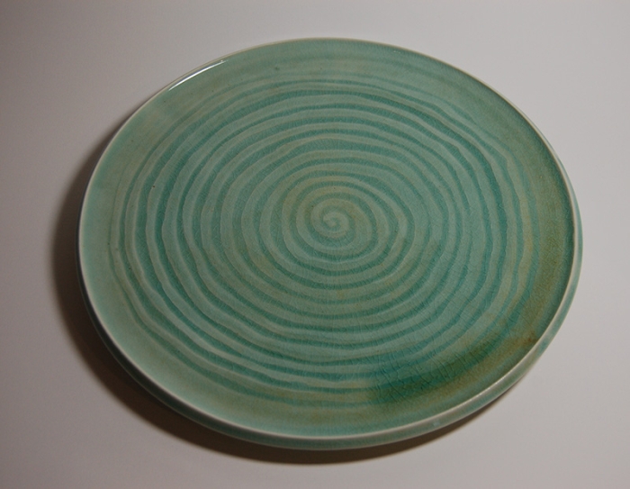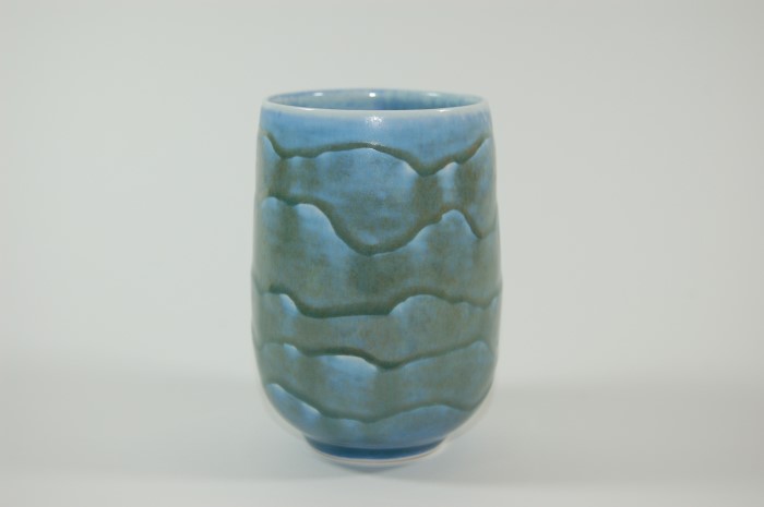 Die Feinheit und Weiße des Porzellan nutze ich häufig für Reliefmuster, farbig-transparent glasiert lassen sie subtile Farbabstufungen entstehen. Weiß auf weiß werden Texte, meist Lyrik, lesbar. Erweitert wird das Spektrum meiner Tätigkeit durch themenbezogene Arbeiten und das Experimentieren mit Raku und Glas.